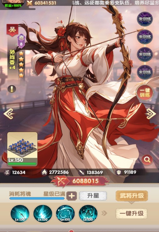 3、深度养成体系,包括武将升级、升星、羁绊、天赋等,助力战力快速提升。